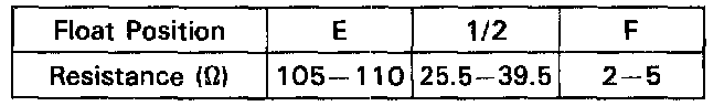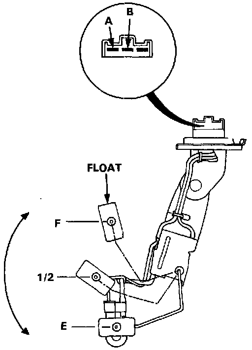 5. Measure the resistance between the A and B terminals at E (empty), 1/2 (half full) and F (full) by moving the float.