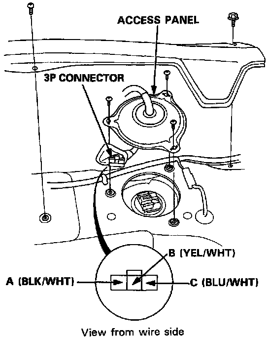 If the light does not come on, remove the access panel and disconnect the 3-P connector from the fuel gauge sending unit. Connect the A (BLK/WHT terminal to the C (BLU/WHT) terminal with a jumper wire.