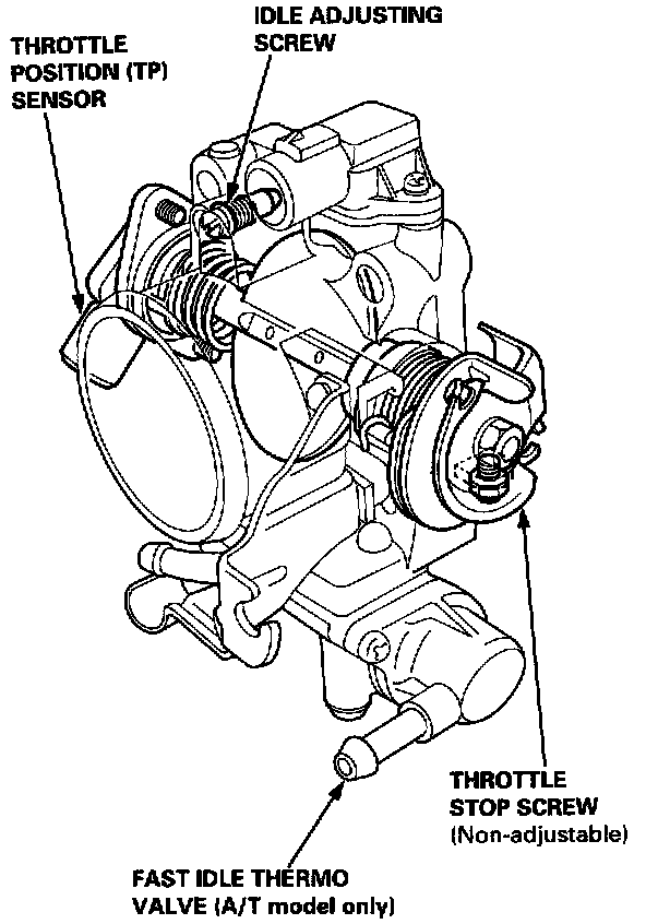 The throttle body is of the single-barrel side-draft type. The lower portion of the throttle valve is heated by engine coolant from the cylinder head. The idle adjusting screw which increases/decreases bypass air is located on the top of the throttle body.