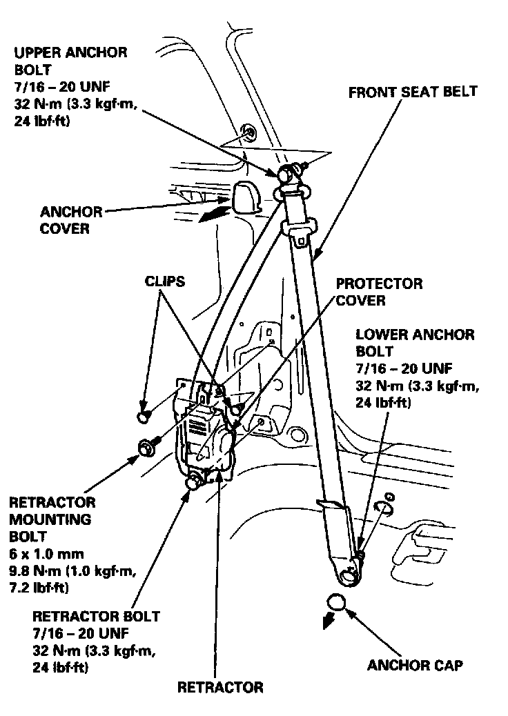 6. Remove all the anchor bolts and the retractor bolt, remove the retractor mounting bolt, then remove the front seat belt and retractor.