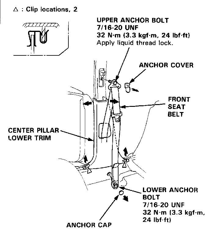 3. Remove the upper and lower anchor bolts from the front seat belt, then remove the center pillar lower trim.