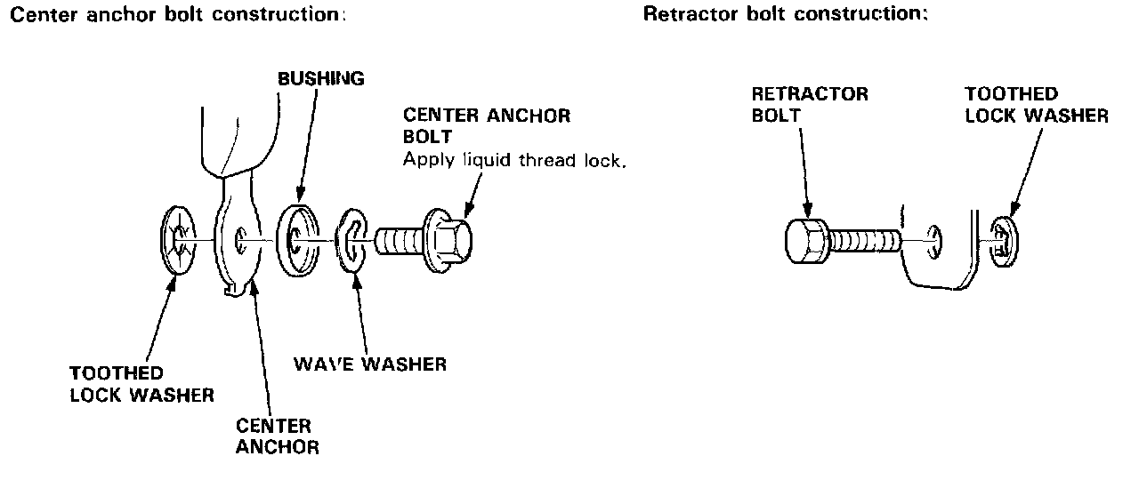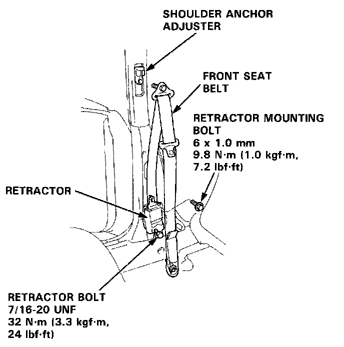 4. Remove the retractor bolt and retractor mounting bolt, then remove the front seat belt.