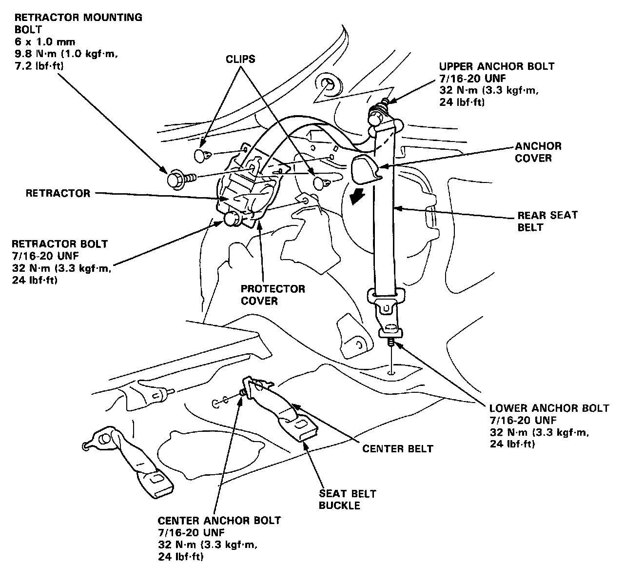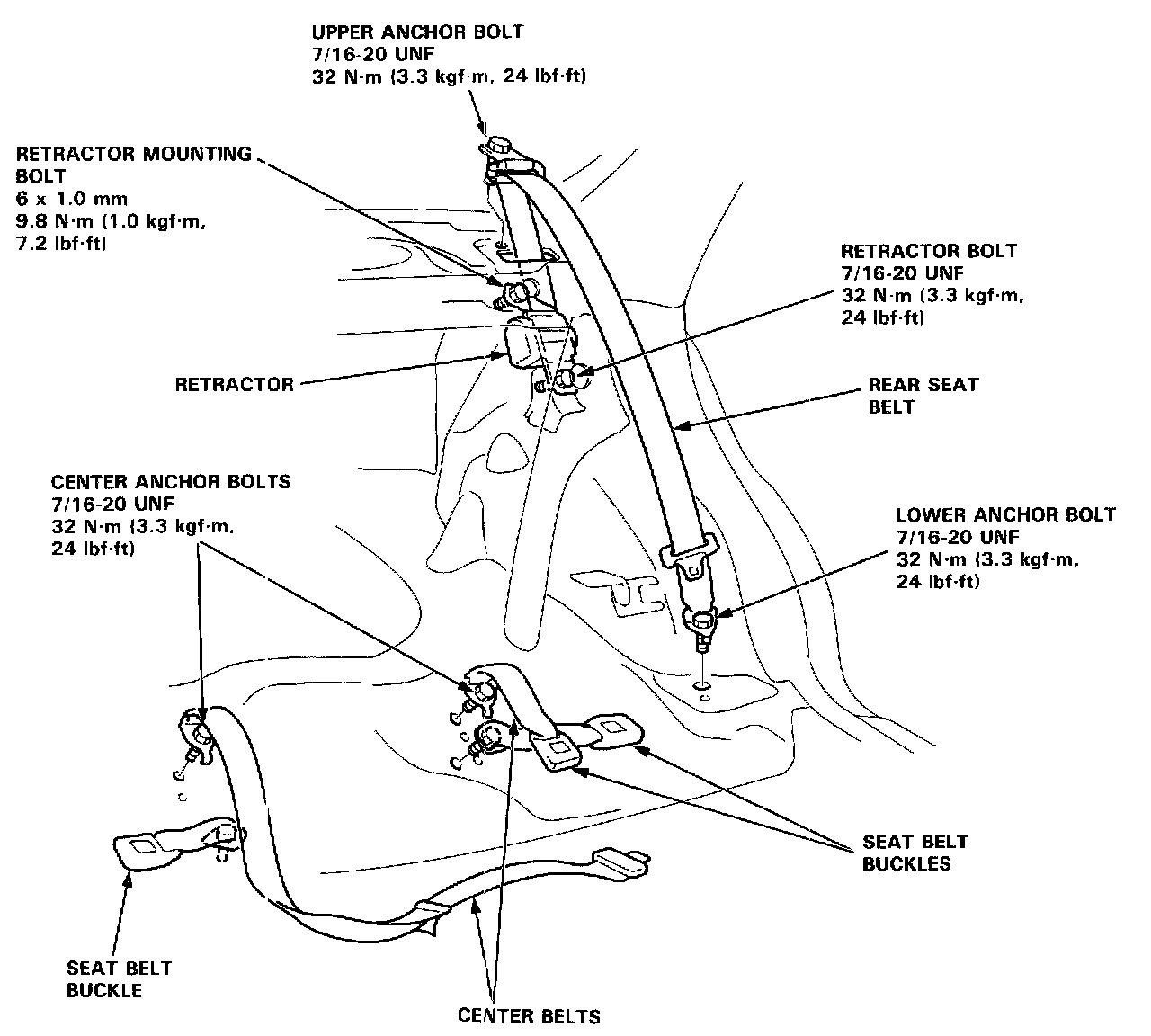 Rear Seat Belt ReplacementCAUTION: Check the rear seat belts for damage, and replace them if necessary. Be careful not to damage them during removal and installation.