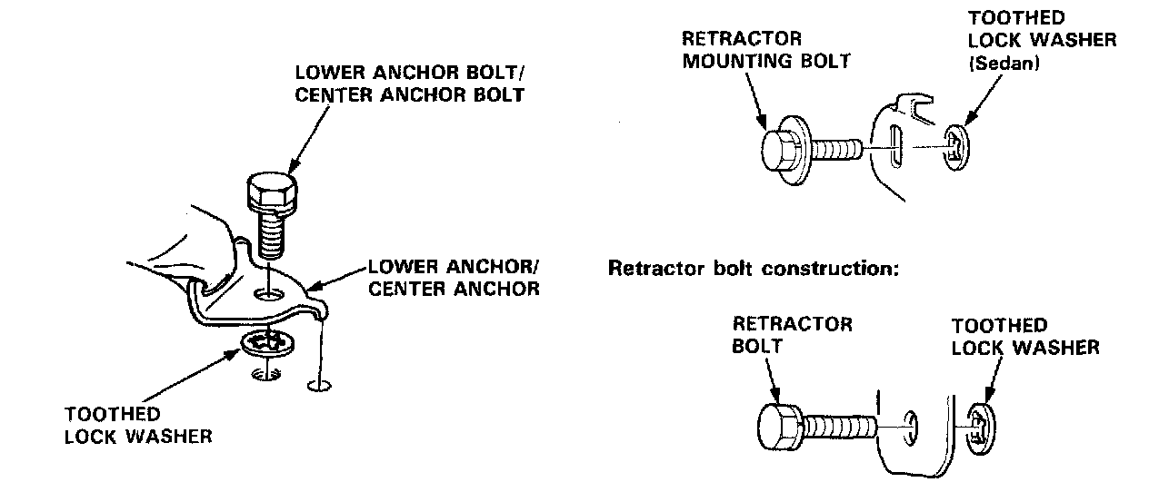 2. Remove all the anchor bolt, the retractor bolt and the retractor mounting bolts, then remove the rear seat belts and center belts.
