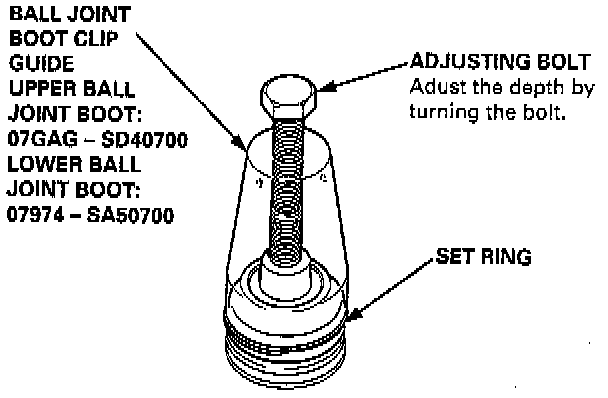Lower ball joint: Adjust the special tool with the adjusting bolt until the end of the tool aligns with the groove on the boot. Slide the set ring over the tool and into position.