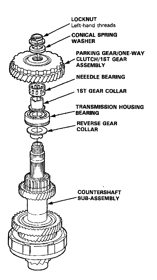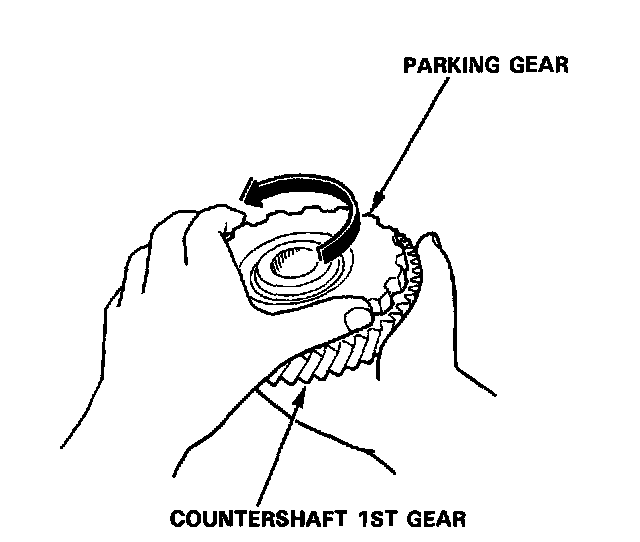 1. Separate countershaft 1st gear from the parking gear by turning the parking gear in the direction shown.