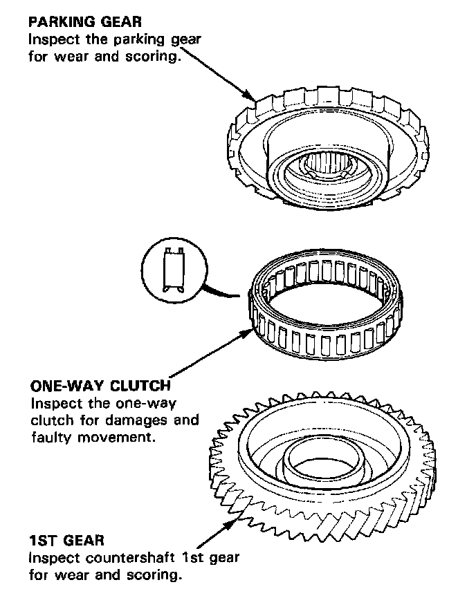3. After the parts are assembled, hold countershaft 1st gear and turn the parking gear in the direction shown to be sure it turns freely. Also make sure the parking gear does not turn in the opposite direction.