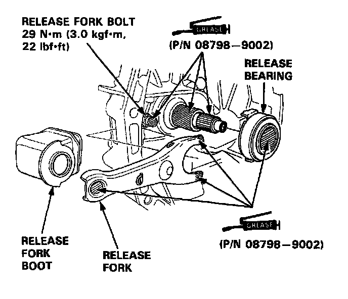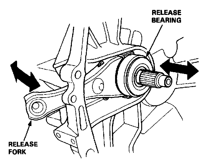 1. With the release fork slid between the release bearing pawls, install the release bearing on the mainshaft while inserting the release fork through the hole in the clutch housing.