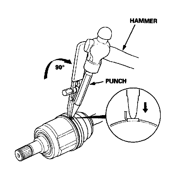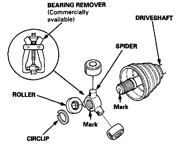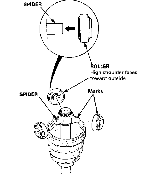 - Reinstall the inboard joint onto the driveshaft by aligning the marks on the inboard joint and the rollers.
