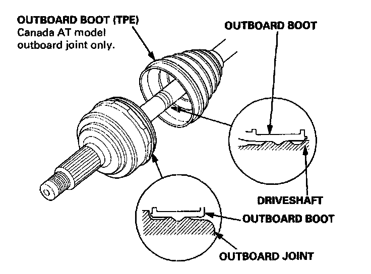 When installing the outboard joint boot on a Canada model, be sure the end of the boot is seated in the grooves of the driveshaft and outboard joint.