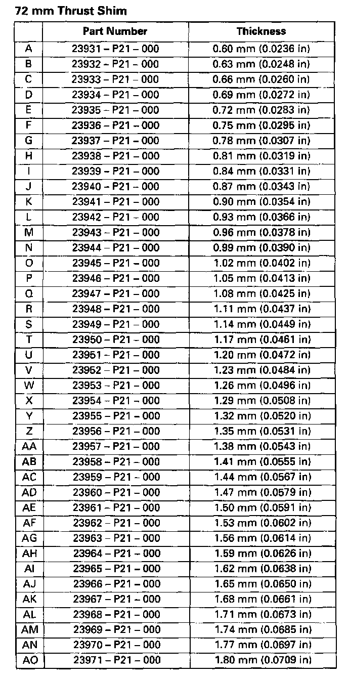 6. Select the proper 72 mm thrust shim from the chart by using the formula below.