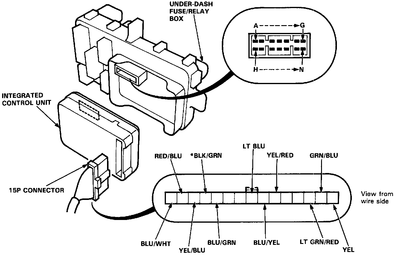 Remove the dashboard lower cover and knee bolster, then disconnect the 15-P connector from the integrated control unit.