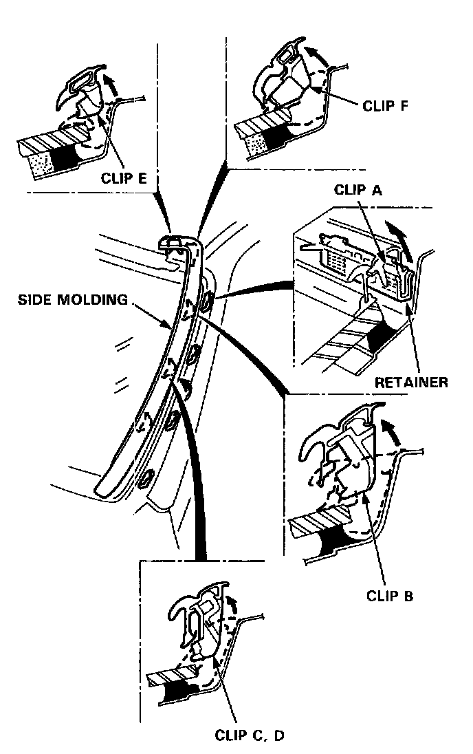 2. Detach the clips from the retainers, then remove both side moldings as shown.