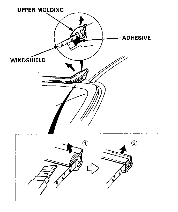 NOTE: When the upper molding removal is difficult, cut the upper rubber portion (J) off, then cut the side rubber portion.