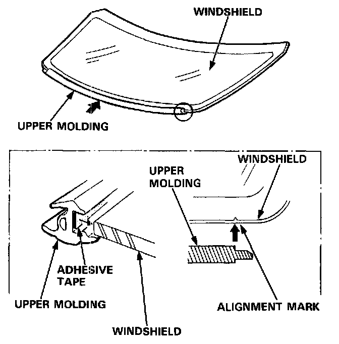7. Set the windshield on the glass brackets, then center it in the opening. Make alignment marks across the windshield and body with a grease pencil at the four points shown.