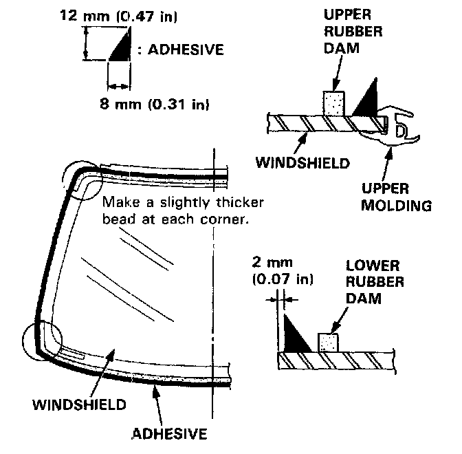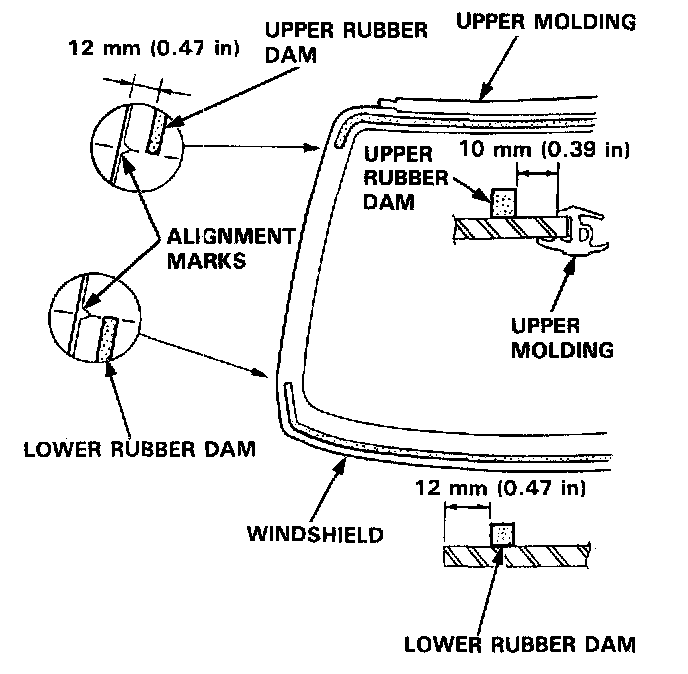 5. Glue the upper and lower rubber dams to the inside face of the windshield, as shown, to contain the adhesive during installation.