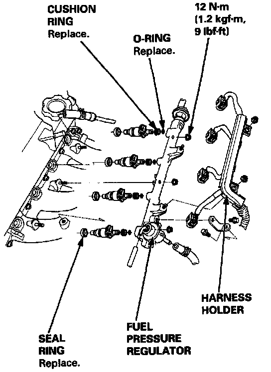 4. Loosen the retainer nuts on the fuel rail and harness holder.