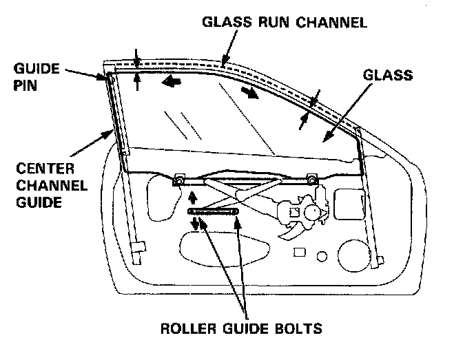 6. Loosen the roller guide bolts, and adjust the glass so it is parallel with the glass run channel.
