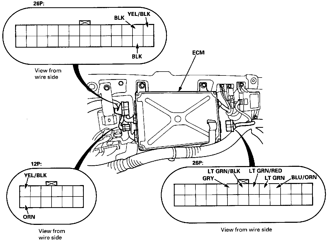 SRS components are located in this area. Review the SRS component locations, precautions, and procedures in the SRS section before performing repairs or service.Remove the bulkhead panel, then disconnect the connectors from the ECM and make the following tests.