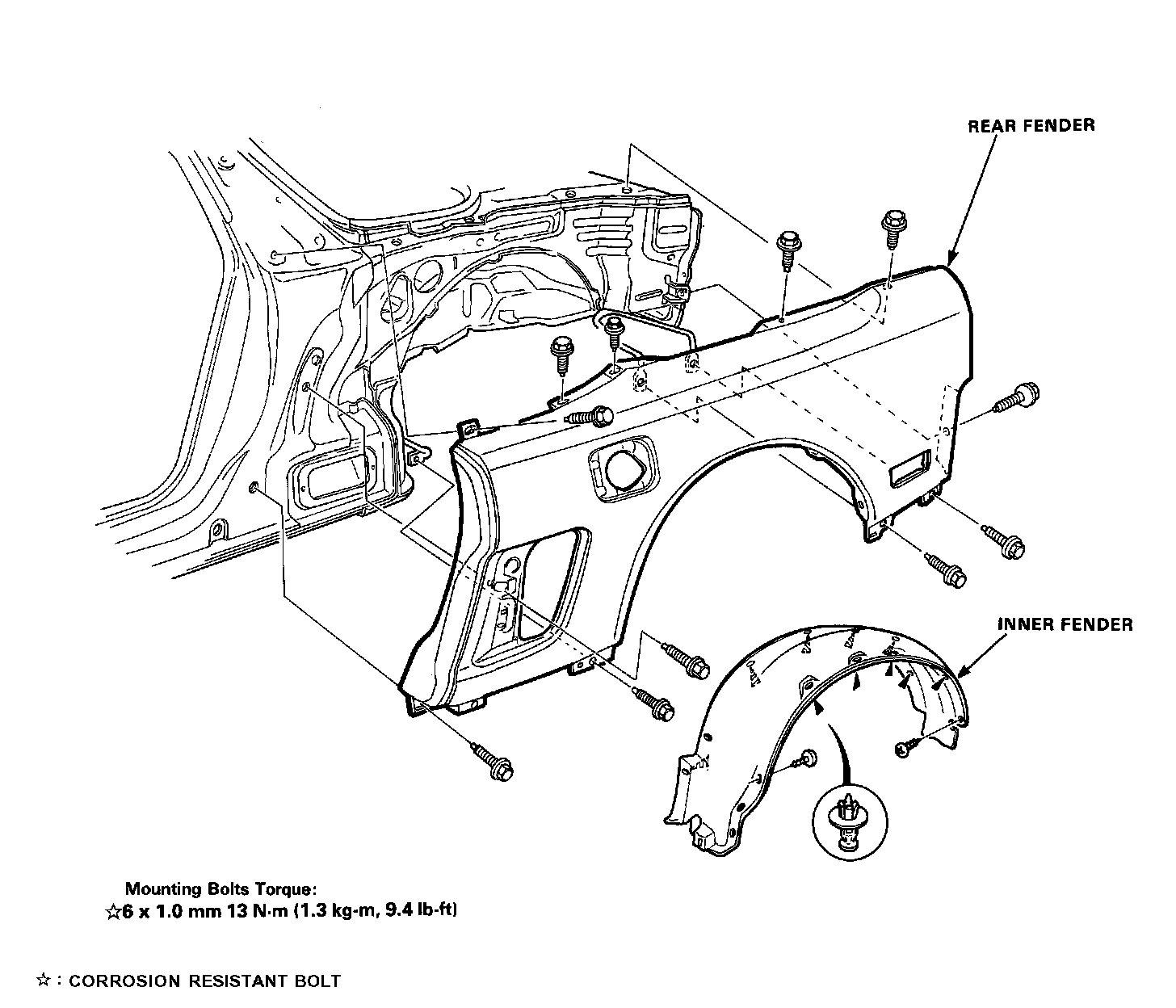 ReplacementNOTE: After installing the rear fender, check the clearance and difference in level between the rear fender and door panel, rear hatch, trunk lid, rear bumper, and rear combination light.