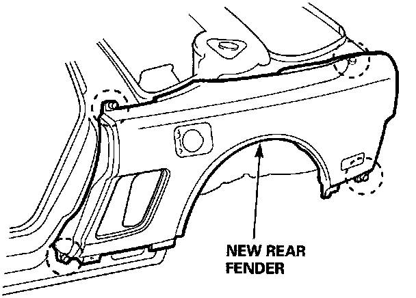 Apply the masking tape to the parts of the side panel, rear hatch, and trunk lid, that are adjacent to the rear fender to protect the painted surfaces from damage.