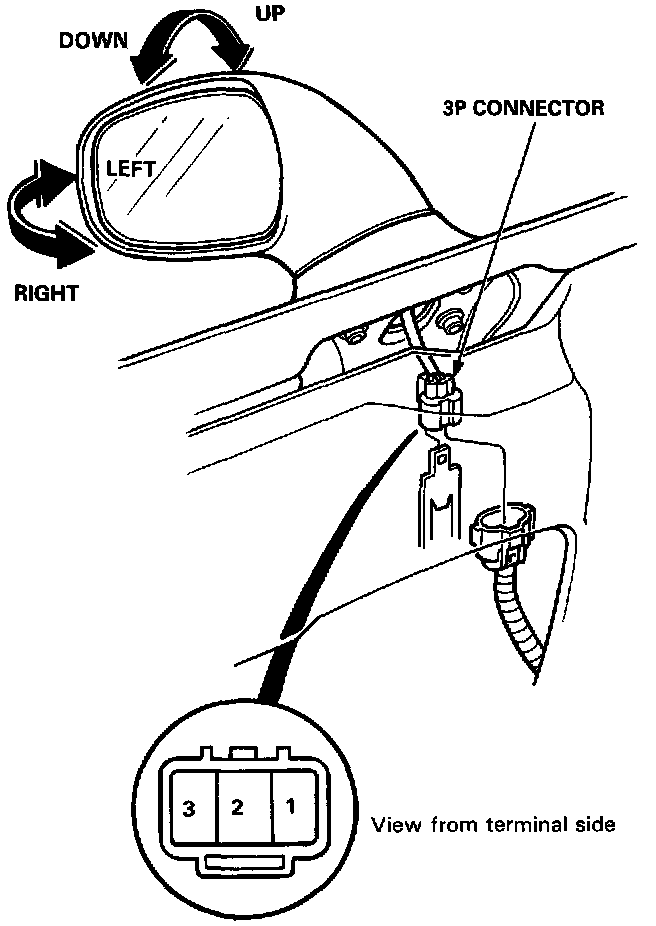 1. Remove the door panel, and carefully remove the plastic cover.2. Disconnect the power mirror 3P connector.