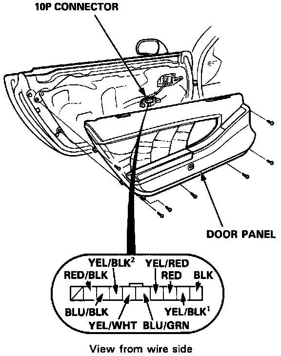 - If the mirror does not tilt down (or does not swing left), remove the right door panel, and check for an open in the YEL/WHT or BLU/BLK) wire between the right door mirror and the switch.