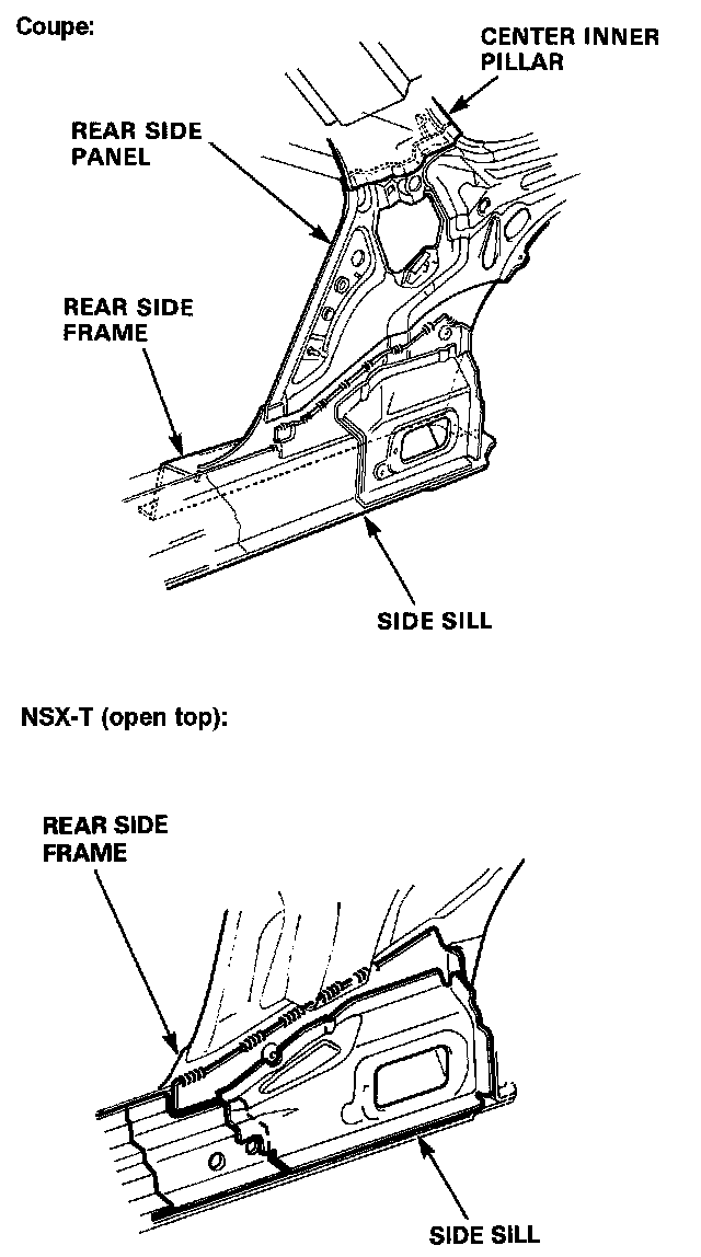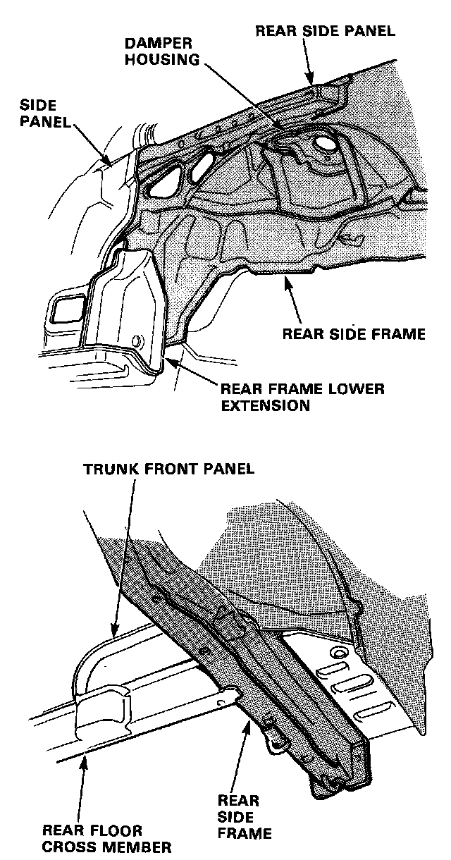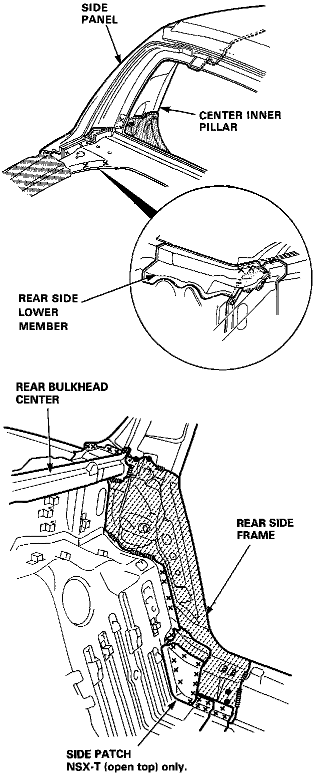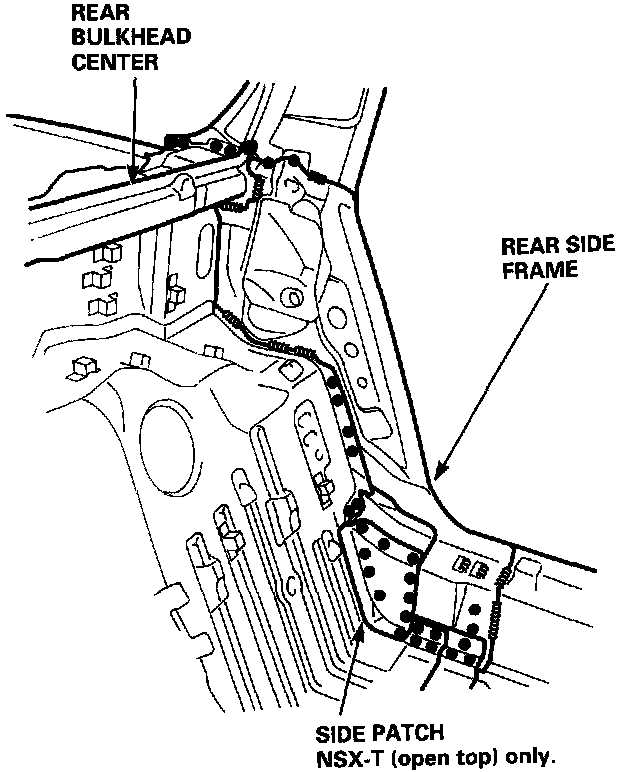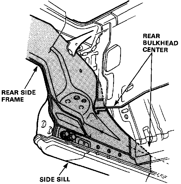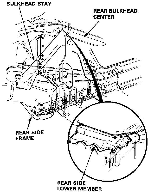 DescriptionThe rear side frame is critical for the rigidity of the rear body and for the installation of the rear wheel suspension, and engine. During replacement, be sure to position the rear side frame by using the positioning jig or to the dimensions shown in the body dimensional drawings.