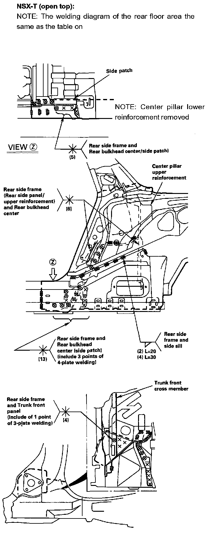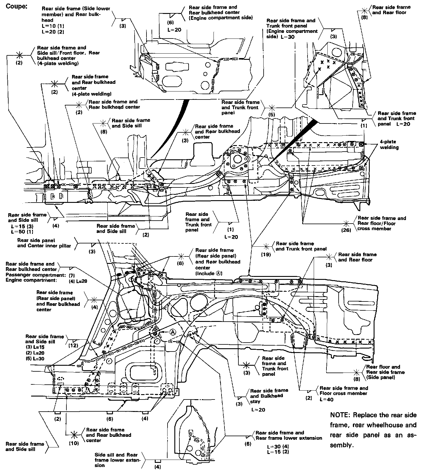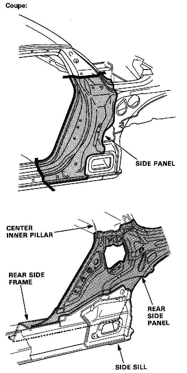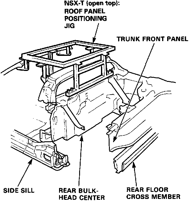 DescriptionThe rear side frame is critical for the rigidity of the rear body and for the installation of the rear wheel suspension, and engine. During replacement, be sure to position the rear side frame by using the positioning jig or to the dimensions shown in the body dimensional drawings.