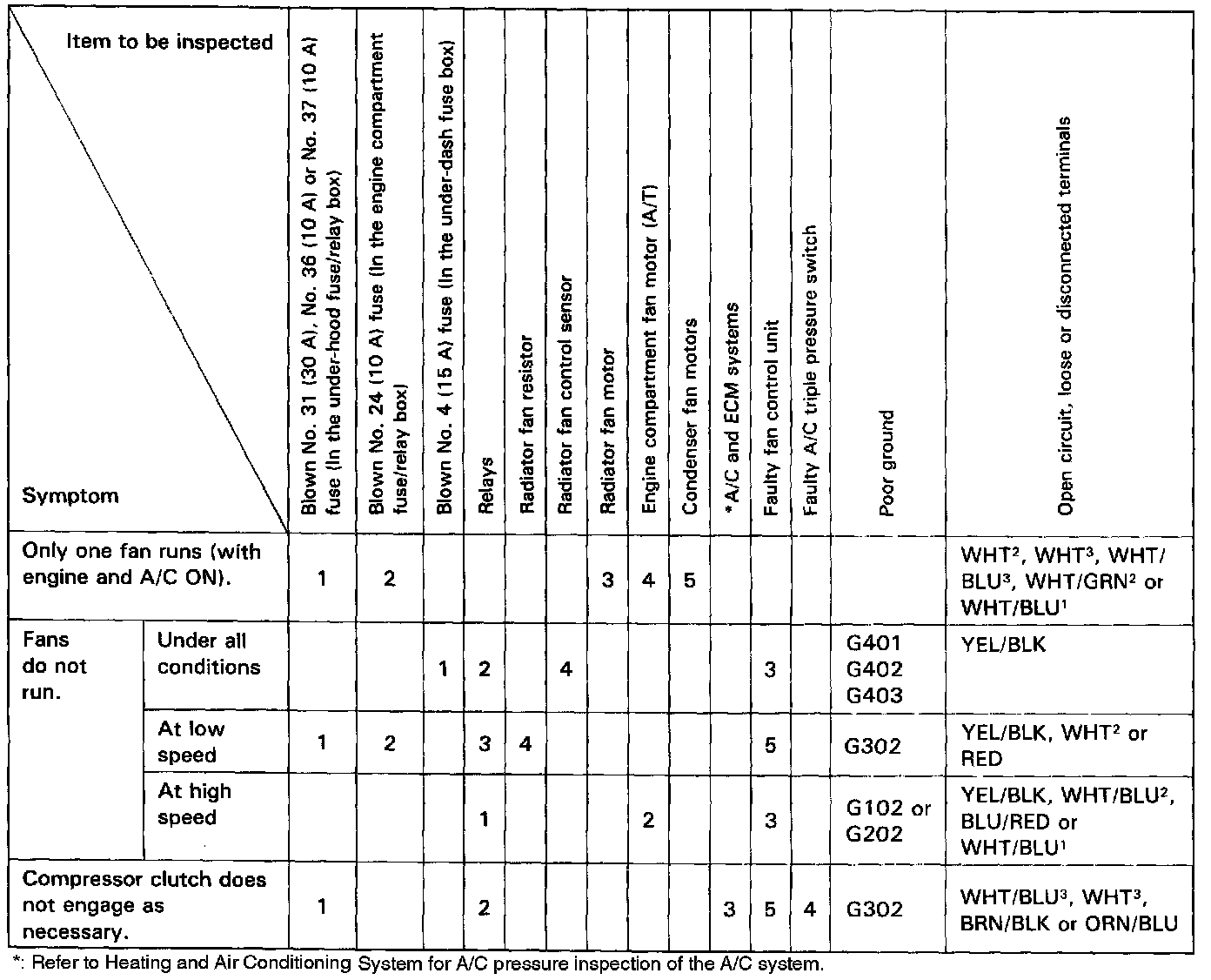 The numbers in the table show the troubleshooting sequence.