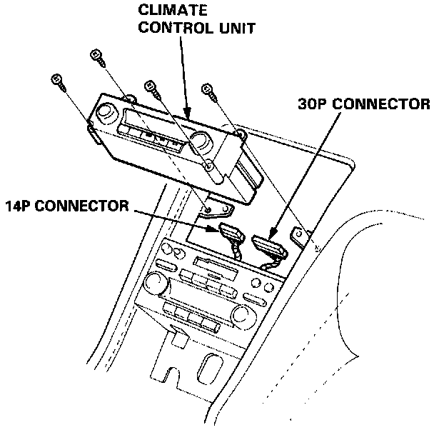 6. Remove the four screws, then disconnect the 14P and 30P connectors from the automatic climate control unit and remove it.