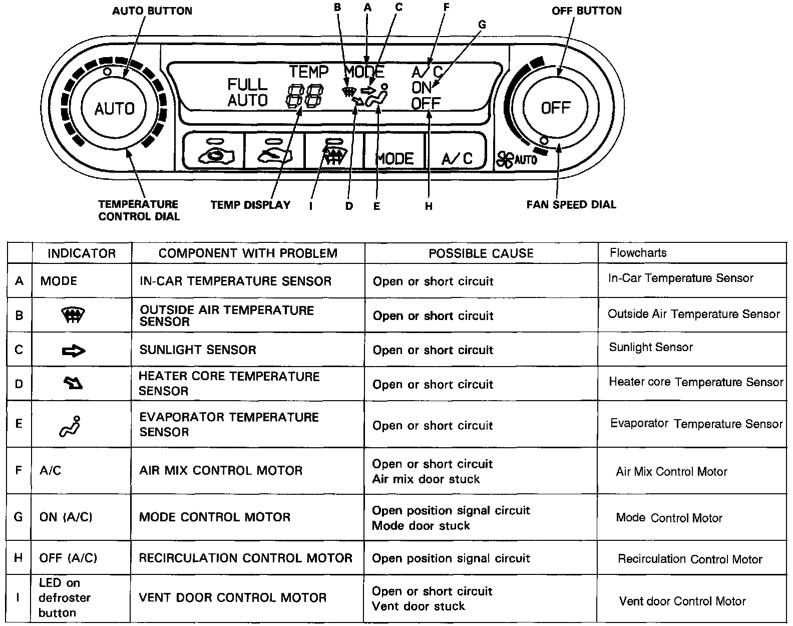 The Automatic Climate Control System has a built-in self diagnosis feature. To run it, turn the ignition switch ON (II), then turn the fan speed dial to the AUTO position. Set the temperature control dial to 60 °F (18 °C), then gradually move the dial up the temperature range to 90 °F (32 °C). At each temperature setting, push both the AUTO and OFF buttons on the control unit at the same time. Wait for at least one minute for the system to readjust and check for problems. If any problems are found in circuits "A" through "I", the system will indicate which circuit has the problem by lighting the respective indicator light.