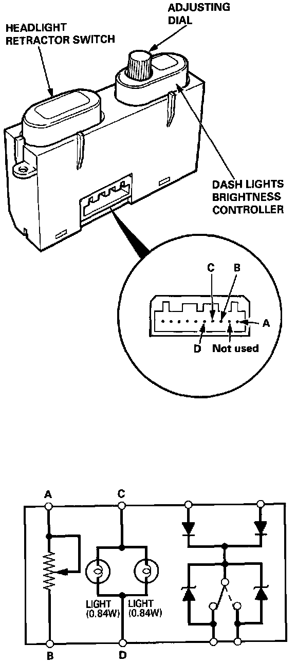 1. Remove the dash lights brightness controller from the instrument panel trim (see Controller Removal).2. Measure resistance between A and B terminals while rotating the adjusting dial. Resistance should vary from 0 to 20,000 Ohms as the dial is rotated.