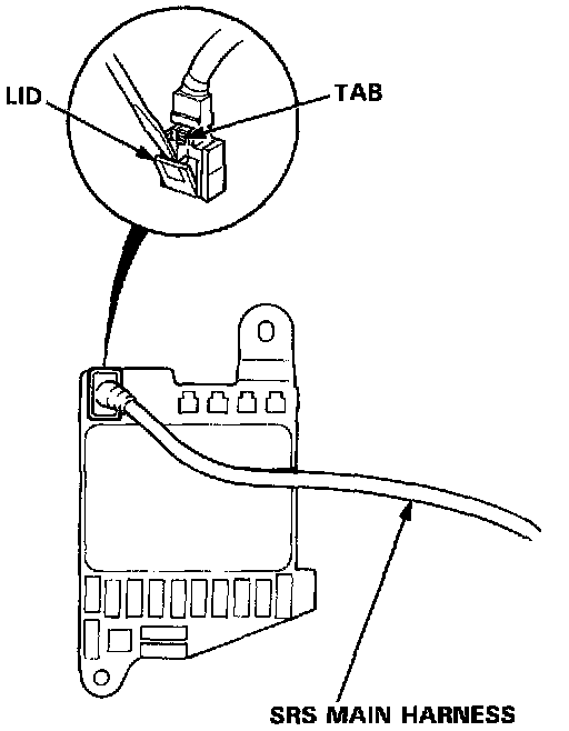 NOTE: The SRS main harness connector is double locked. To remove it, first lift the connector lid, then press the connector tab down and pull the connector out.