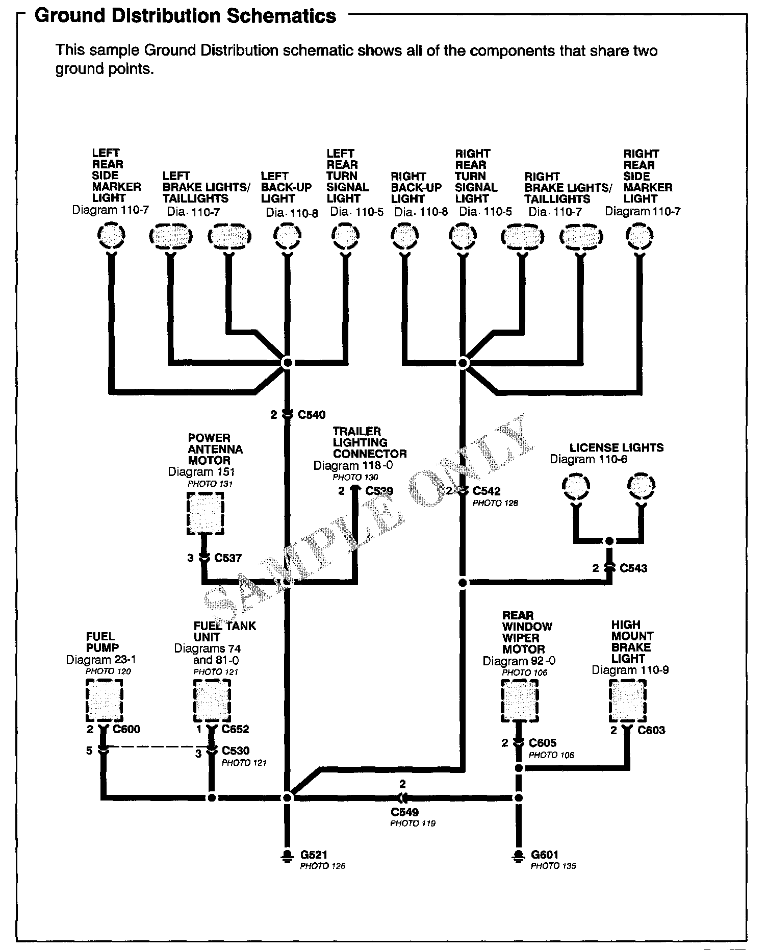 This sample Ground Distribution schematic shows all of the components that share two ground points.