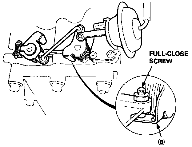 4. Check that (B) of the IAB control valve is in close contact with the full-close screw when you apply 50.7 kPa (380 mmHg, 15.0 in.Hg) of vacuum to the IAB control diaphragm.