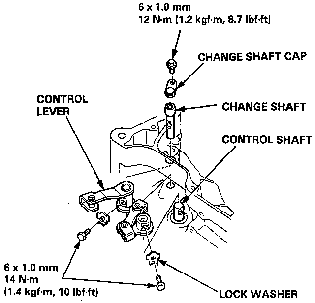 15. Install the control lever, new lock washers, change shaft, and change shaft cap on the other end of the control shaft. Tighten the bolts, then bend the tab against the bolt head.