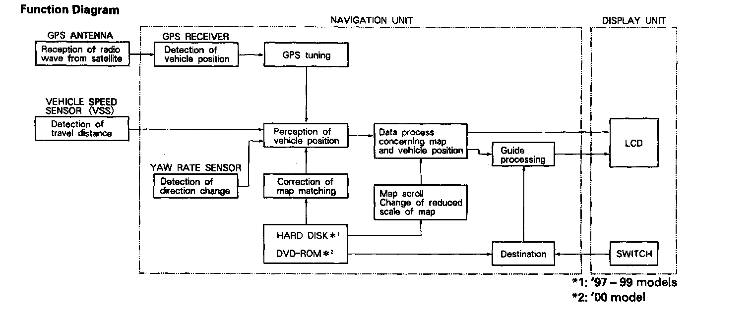 The navigation unit calculates the vehicle position and guides you to the destination. The unit performs map matching correction, GPS correction, and distance tuning. It also controls the menu functions and the hard disk drive. With control of all these items, the navigation unit makes the navigation picture signal, then it transmits the signal to the display unit and audio driving instructions to the audio unit.