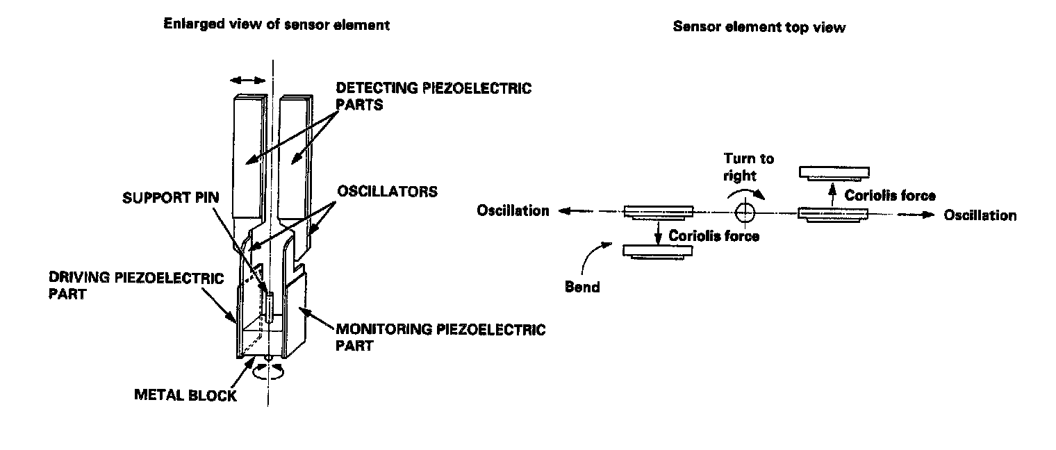 The sensor element is shaped like a tuning fork, and it consists of the piezoelectric parts, the metal block, and the support pin. There are four piezoelectric parts: one to drive the oscillators, one for monitoring that maintains the oscillation at a regular frequency, and two to detect angular velocity. The two oscillators have a 90 degree twist in the center, are connected at the bottom by the metal block, and supported by the support pin. A detecting piezoelectric part is attached to the top of each oscillator. The driving piezoelectric part is attached to the bottom of one oscillator, and the monitoring piezoelectric part is attached to the bottom of the other oscillator.