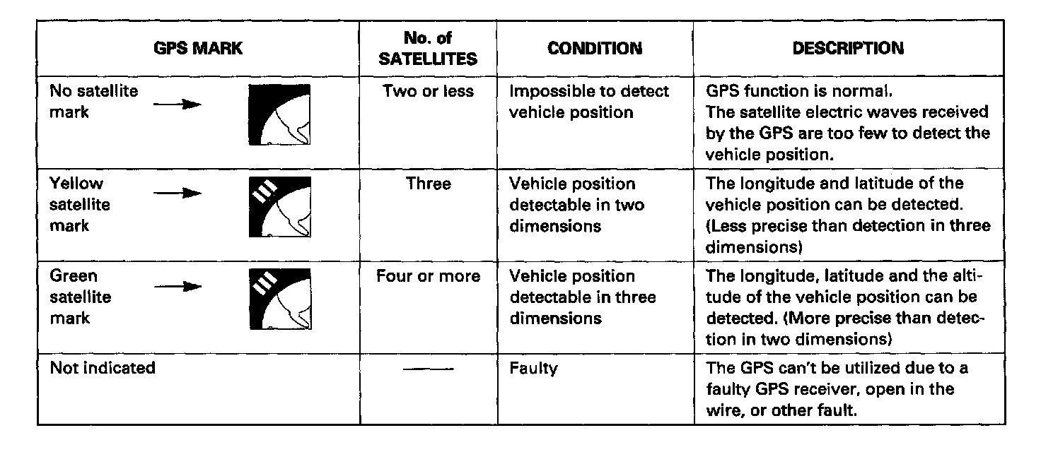 The precision of the GPS varies according to the number of satellites from which electric waves are received and the control condition. The precision is indicated by the GPS mark shown on the upper left of the display.
