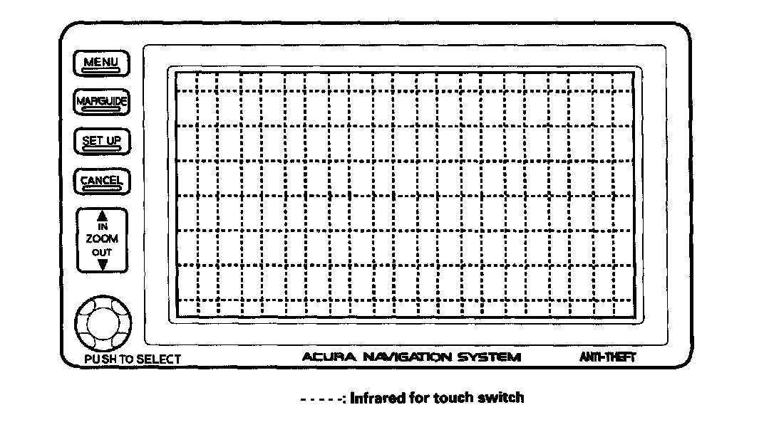 The display unit uses liquid crystal display (LCD). The LCD is a six-inch-wide, Thin Film Transistor (TFT), stripe type with 220,000 picture elements. The color film and fluorescent light are laid out on the back of the liquid crystal film. The touch sensor on the front of the LCD is an infrared type with nine vertical and nine horizontal infrared rays to produce 81 sensing points. The display unit transmits the signal from each operation key and the touch switches to the navigation unit.