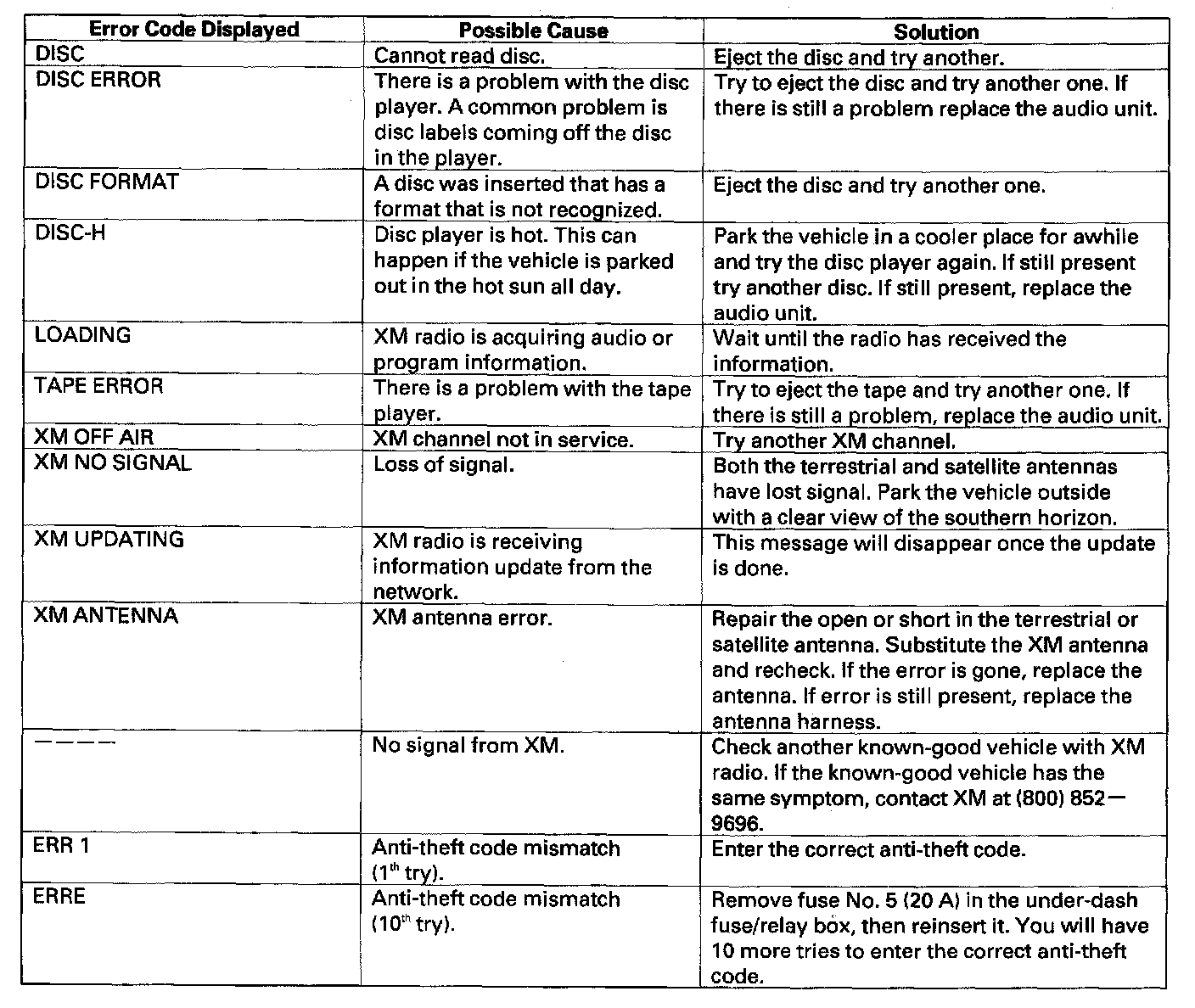 The audio system displays error codes when a problem is detected with the disc changer, the disc, the tape player, the XM radio, or the anti-theft code.