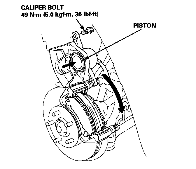 12. Push in the piston so that the caliper will fit over the pads. Make sure the piston boot is in position to prevent damaging it when pivoting the caliper down.