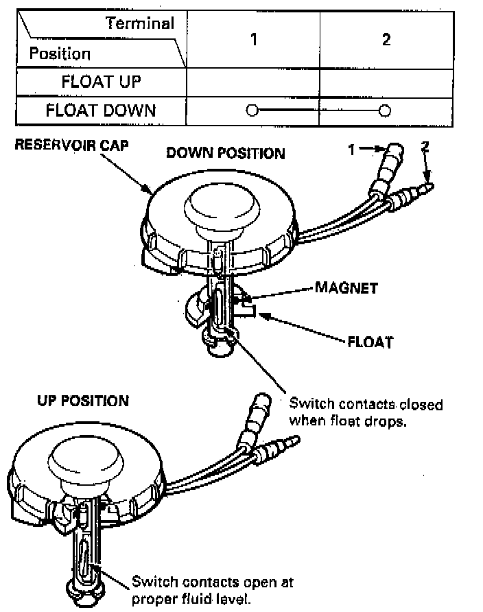 1. Remove the reservoir cap. Check that the float moves up and down freely; if it doesn't replace the reservoir cap assembly.2. Check for continuity between the terminals in each switch position according to the table.