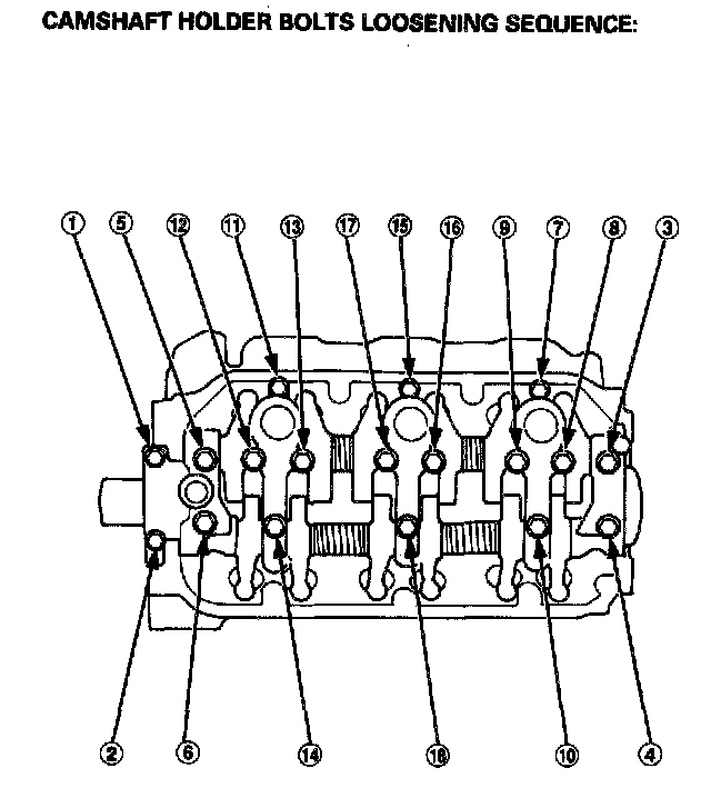 - To prevent damage to the valves or rocker arm assembly, unscrew the camshaft holder bolts two turns at a time in a crisscross pattern.