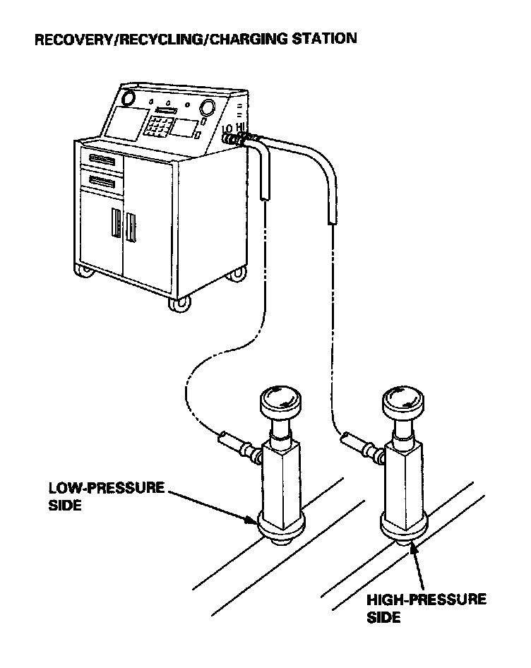 1. Connect a R-134a refrigerant recovery/recycling/charging station to the vehicle, as shown, following the equipment manufacturer's instructions.