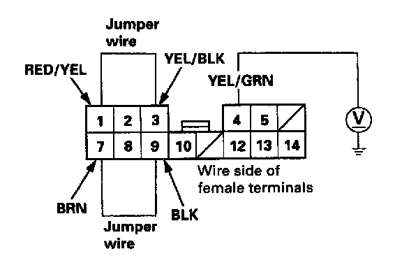NOTE: Before testing, connect a voltmeter and jumper wires as shown.
