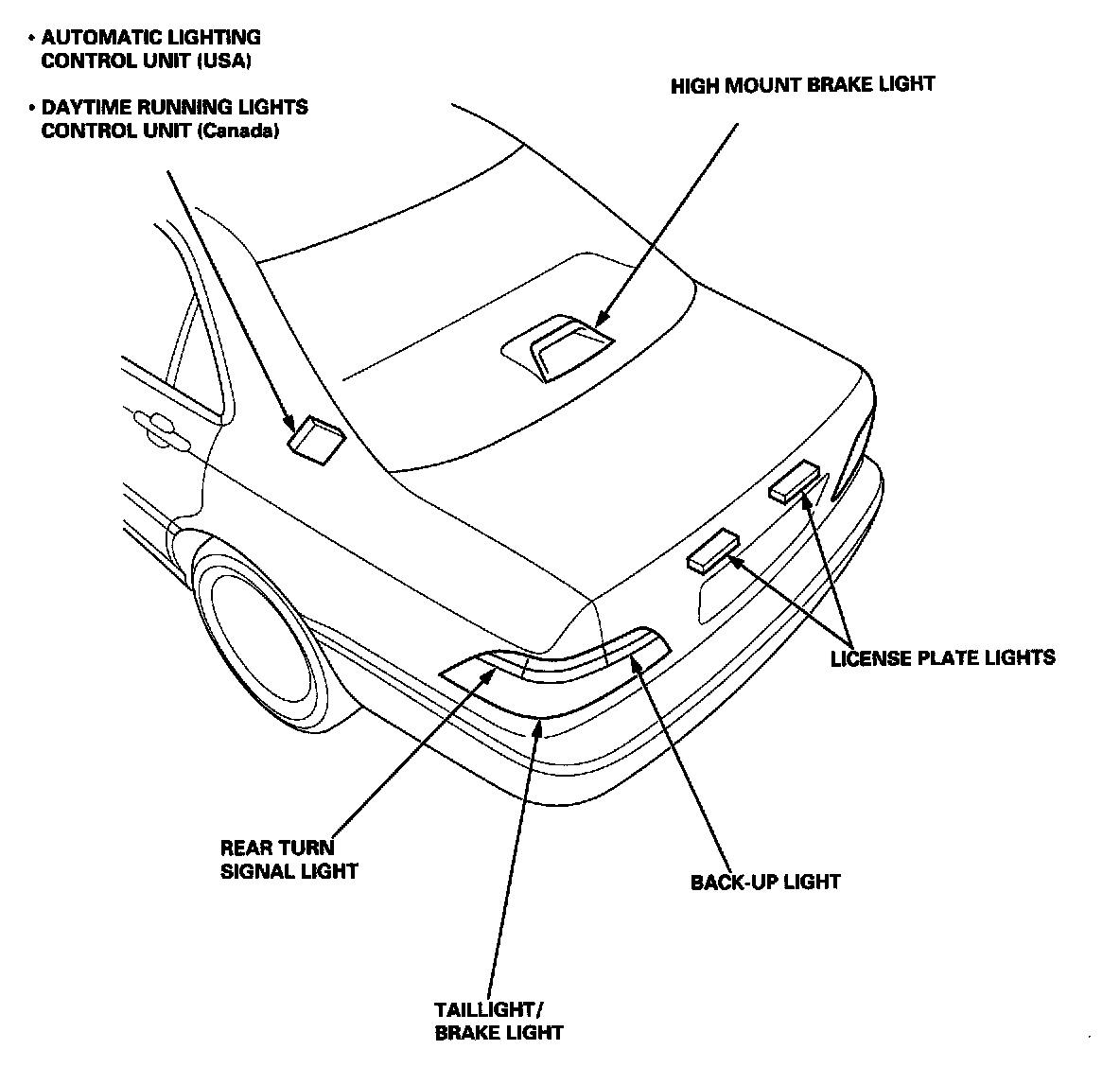 Automatic Lighting System: When the combination light switch is in the "AUTO" position, the automatic lighting control unit turns on the headlights, all other exterior lights, and the instrument panel lights when the ambient light is low. The control unit receives signals from the automatic lighting sensor, which senses the lux (illumination) level outside the vehicle, and it controls the lights by means of the lighting relay and taillight relay.
