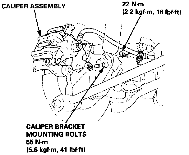 5. Remove the caliper bracket mounting bolts and hang the caliper assembly to one side.