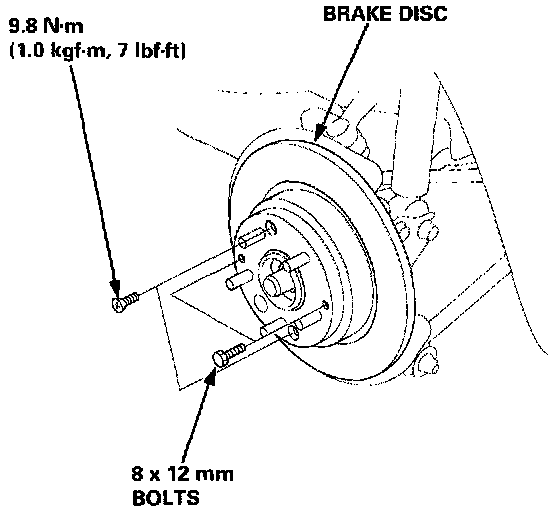 7. Screw two 8 x 12 mm bolts into the disc to push it away from the hub. Remove the brake disc.